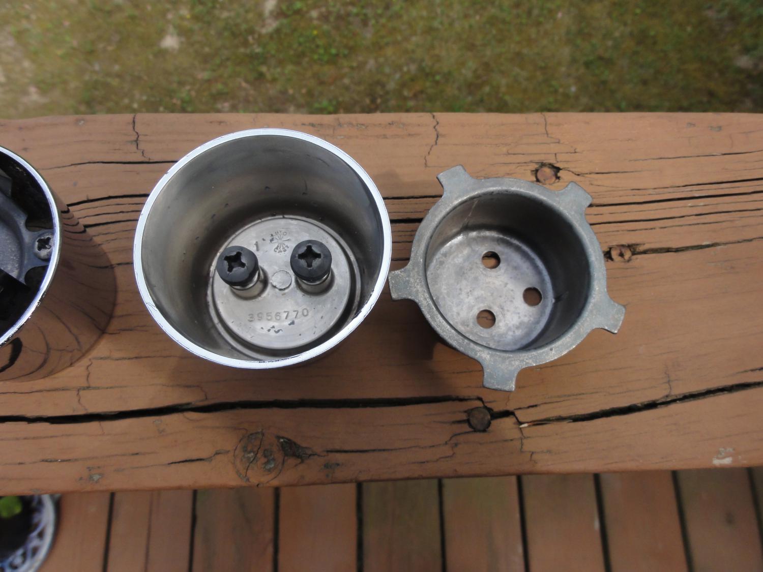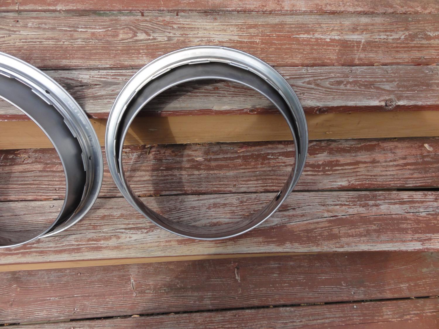 3 original trim rings driver condition , 2 are very decent have usual scratches very small rash on one, etc,. 1 has curb rash.Center caps are nice survivor condition. Push on one has all prongs in tac, minute specs in chrome more noticeable in pics. Screw on cap is excellent survivor condition, has original screws & retainer thread holes are good.( 3 trim rings 75.00)( Push on cap 50.00) (Screw on cap 65.00) Plus shipping on all items . Look at pictures for condition of all items. I posted a lot of them.