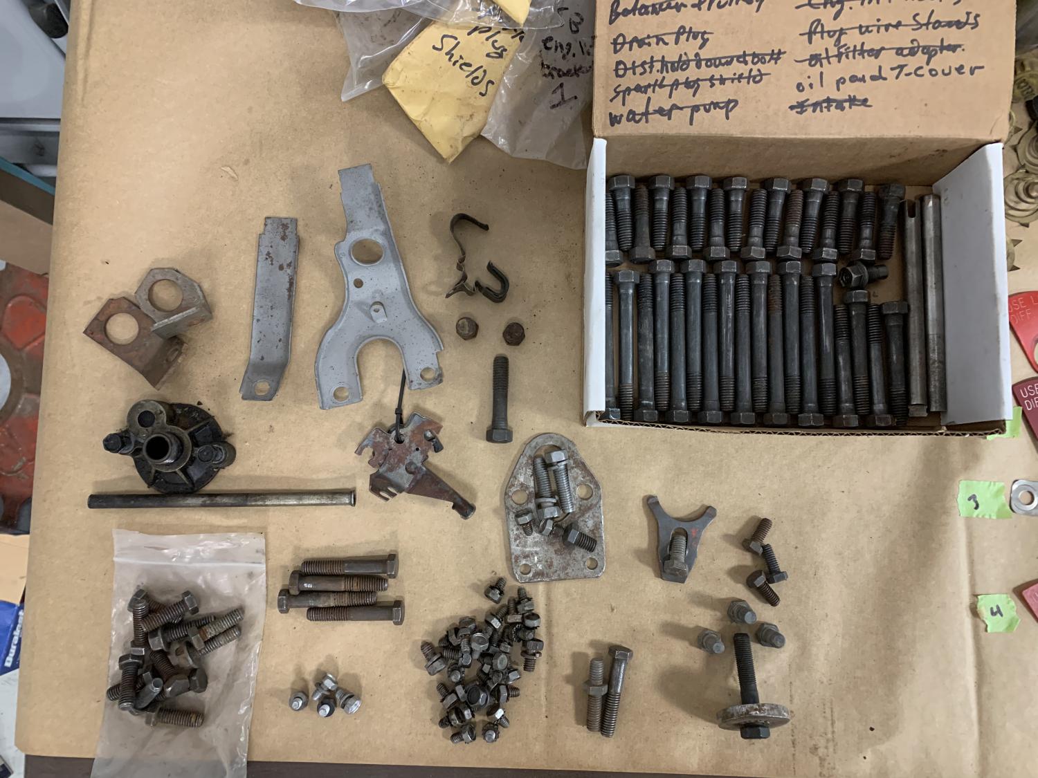 O marked head bolts A marked oil drain plug Two eng. lift hooks 3 cam sprocket L Oil pump bolt. TR Distributor hold down & bolt M Crank pulley bolts 3 NAT Balancer bolt & washer TR T stat bolt & stud RSC Water pump. RSC Spark plug shields. RBW Oil filter mount & bolts. RBW Intake. 10 A & 2 RBW Spark plug wire separators 4 piece Plug wire stands 2 piece Lower oil dipstick tube Coolant plugs @ side of block Battery cable supports @ oil pan Fuel pump bolts anchor marked Fuel pump plate & bolts E Fuel pump push rod access @ front of block bolt SB Oil pan bolts. 14 E & 4 B&H Timing cover bolts. E 135.00 shipped lower 48 PayPal friends & family Thanks Eddie |