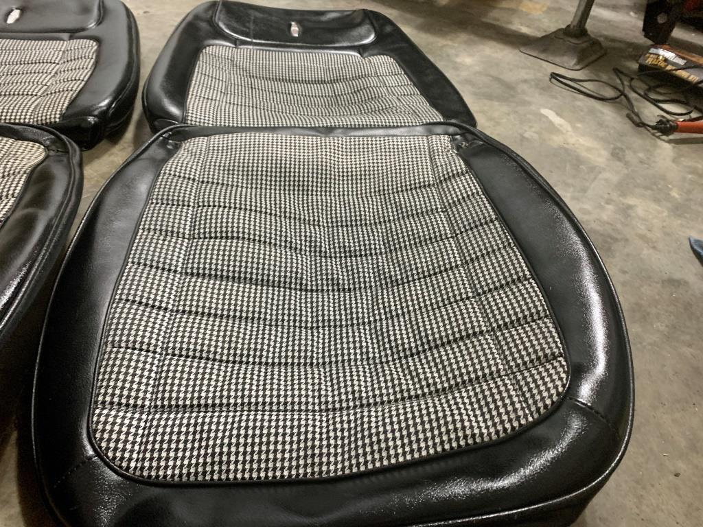 '68 Deluxe interior houndstooth seat covers. I would consider them to be pretty nice. There is a rub mark on the pass top and are 2 wear spots (one on driver bottom and the other on the passenger top in the houndstooth) but I feel a good upholstery person can repair. There is also one small puncture on the pass bottom on the tunnel side that too and have a patch laid on the inside and repaired push its on the tunnel side so will most likely not be seen especially if you have a console car. Regardless still a very rare pair of covers in this condition. $750 plus shipping.