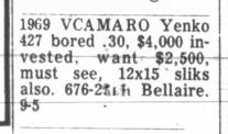 Original ad from local newspaper 1978. Later was asking $3500 in the local Green Tab classifieds -this was 1992.