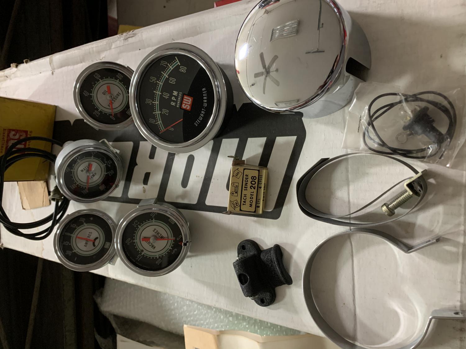 NOS Stewart Warner Green line 2 5/8 mechanical oil press. Mechanical water temp, amperes & vacuum gauges. NOS greenline 3 3/8 8000 rpm Tach plus NOS tach cup. All nos in beautiful shape with boxes. 1100.00