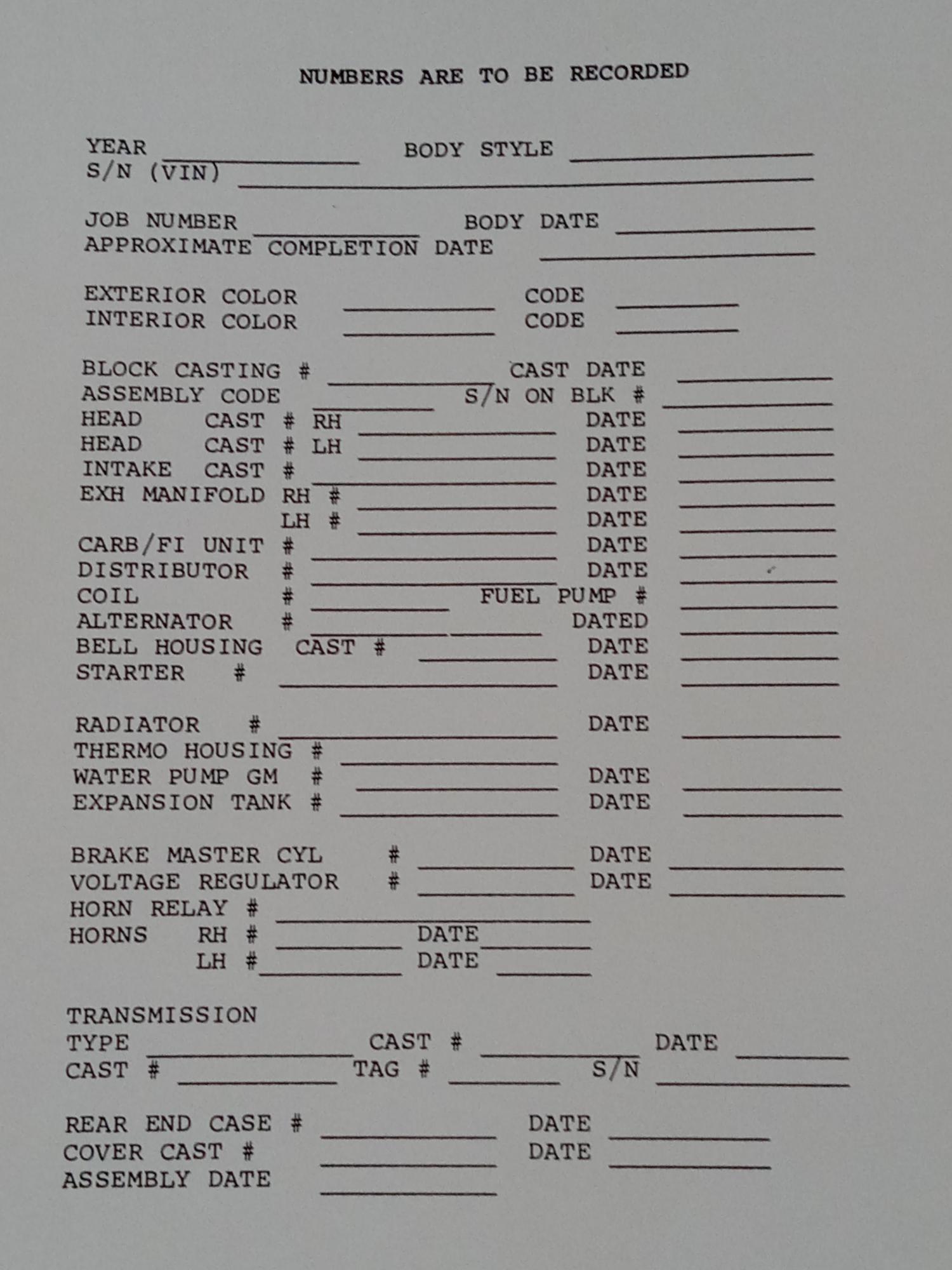 Mike, the equivalent to the NCRS form you're looking for is called the Camaro Legends - Numbers Verification. Its a MS Excel spreadsheet which I have just emailed to you.