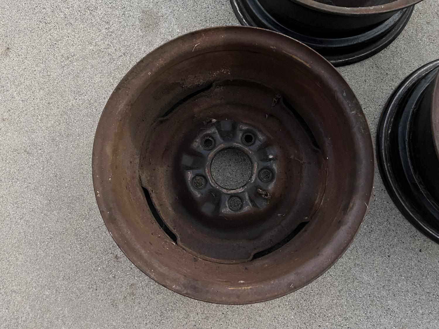 Just rescued from yet another resto mod of a 1969 convertible. They spin straight and have only a minor rim nick or two as shown. One sat for the longest time face up and rusted a bit in the spider web as also shown. Lug holes good and not wallowed out. I believe these are SS / SS396 plain wheels - they will certainly clear disc calipers - both four and single piston versions of 1968 and 1969. Will fit many other GM cars of the era as well of course. Only three available as shown - the fourth wheel was / is a rally - a YW ralley I believe... that one will be for sale tomorrow and I'll post an ad for it... Priced individually at the beginning of the ad. Not getting any easier to find, these... No dates by the valve stem - just faint "XE" stampings as shown. Clearer in person; takes some imagination through these photos; sorry about that. The inside hoops and beads of the wheels are very nice - I just removed the ancient tires yesterday; two bumps by the valve stem hole as well, of course. These are absolutely as found, and I suspect, original black paint - but, of course, I cannot be totally sure on that - just using context clues. Take a look at the photos again, these are hard to find rims anymore, IMHO. Cheers Friends, Anthony |