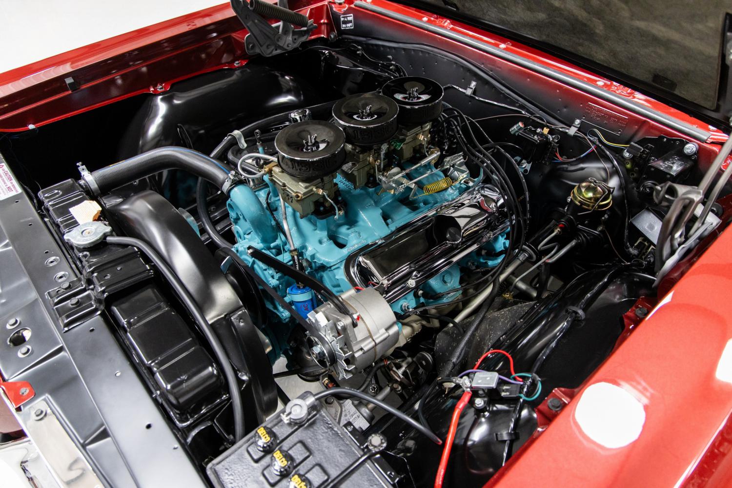 The exterior of this beautiful specimen is spectacular to say the least. The factory design is timeless and iconic. During the restoration process the body was stripped to bare metal. Any sheet metal that needed attention was replaced and not repaired. The body is very straight with excellent gap lines throughout. The doors open and close very nicely. The car was refinished in its factory original color of Marimba Red which is desirable among collectors. The paint work is exceptional throughout and was recently detailed to a high gloss finish. The front windshield, vent glass, door glass, quarter glass and rear windshield was replaced new date code stamped glass from Auto City Glass. Everything on the exterior was restored or replaced including the glass stainless trim, wiper arms, antenna, driver's side mirror, headlight bezels, front bumper, nickel plated front grill, fender trim, door handles, rocker moldings, NOS tail lights, rare back up light delete rear bumper and emblems. The car sit's proudly on reproduction Hurst 14” 5-spoke polished wheels with US Royal Safety 800 7.50x14 redline tires. Although the Hurst wheels weren't a factory installed option, they're era correct for the timeframe and were a popular choice.