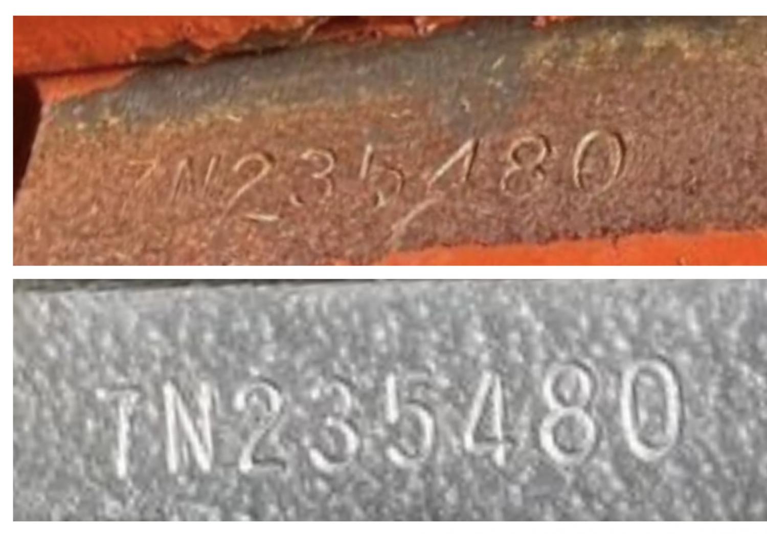 VIN on engine and trans seem to generally match. Although tough to tell exactly with angle of pic of block. There are known cases of multiple VIN stamps. So either original drivetrain was found and reunited with car or, most likely restamped together?? |