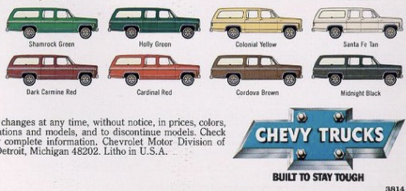 In 1979 the greens were called Holly Green and Shamrock Green. I think the ultimate tow vehicle would be a green, green 1979 Suburban with a green interior on a modern chassis. I would like to see if my favourite colour combo on a seventies square body translates and works on a Suburban…… or too much of a good thing? Ryan W31