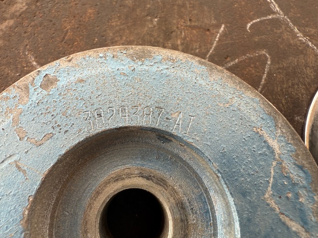 Selling 2 deep groove alternator pulleys. One has a part number 3829387-AI and the other one has it written on it. One has been chromed. They are identical is size/ The price is 120 PPFF shipped lower 48 USA. Larry