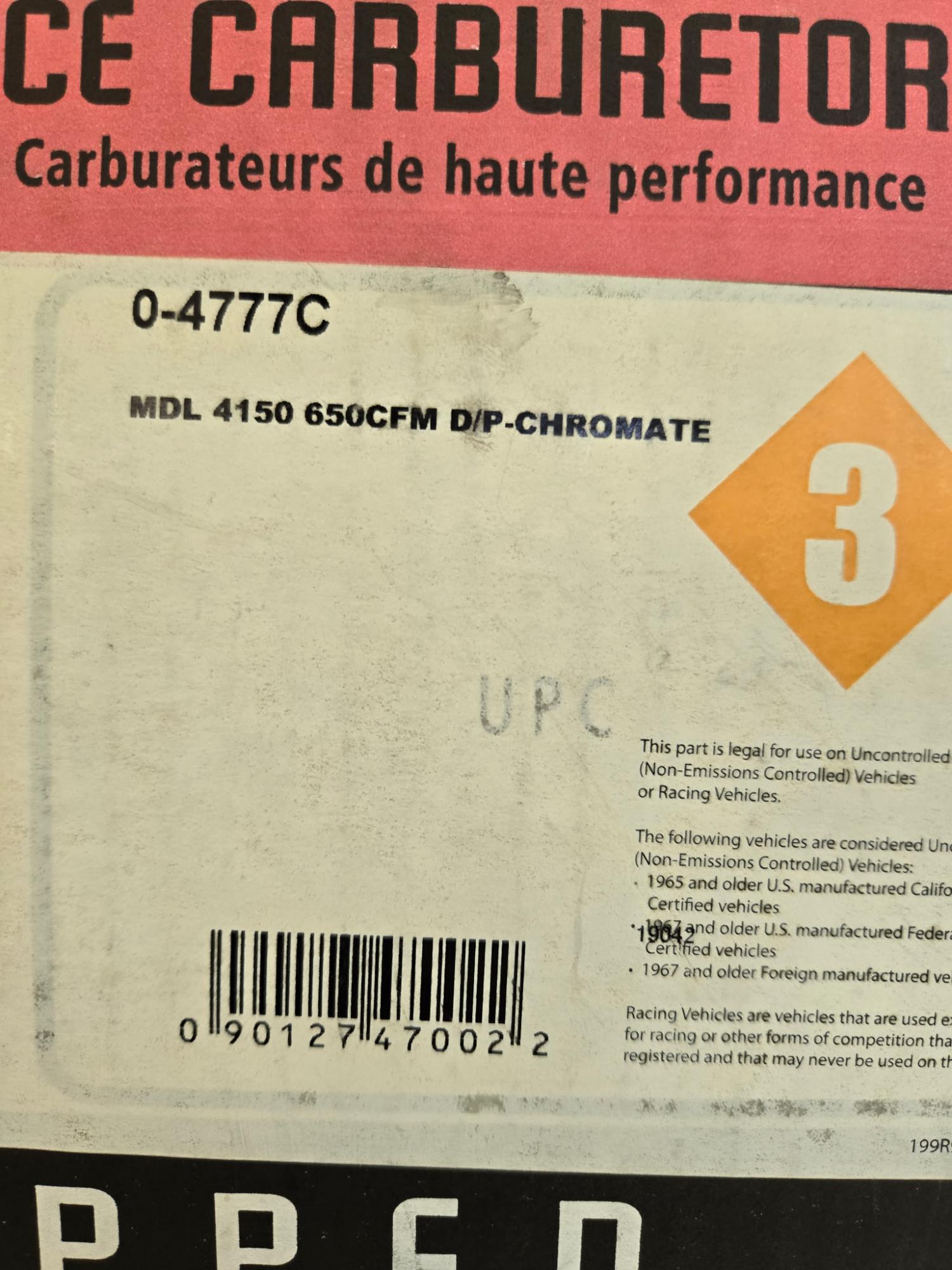 New in box Holley 650 (0-4777C) 650 cfm double pumper carburetor Any questions please call George (253) 888-9481. Price is $550.00 and that will include shipping cost.