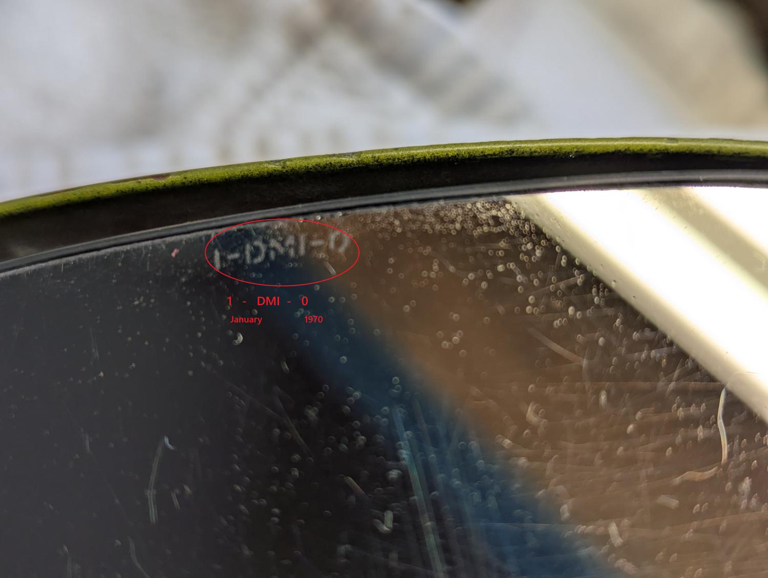 side view mirror glass, before you polish thru the refective silver mirror finish 2) If I buy new replacement glass with NO date codes I lose Originality Points If my glass is too scratched I lose Condition Points 3) Pic below shows date code of Jan 1970 (1 - DMI - 0) I have other 70+ Camaro Sport Mirrors where the right hand number is 9 and one that is 8......Was this same glass used in earlier Chrome Mirrors as I can undertsand why the 8 (1968) Year Code