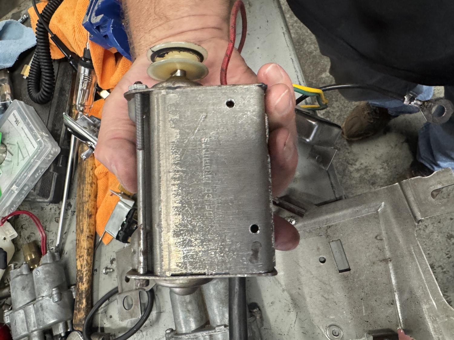 It almost looks like the Corvette headlight motor. You can call Bill Naeger at 618 656-5398 or 618 803-8554 [email protected]. CGR Restoration rebuilds the headlight motors too. Their contact info is 864 642-9308 www.cgrrestorations.com.