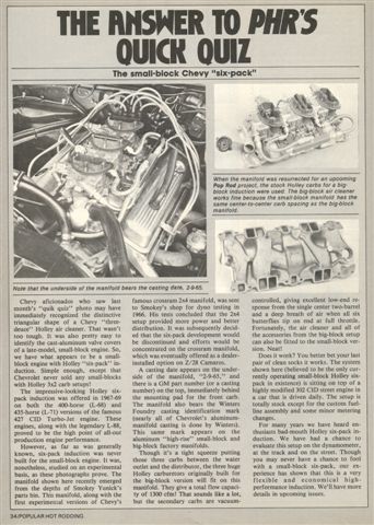 There was also a small block GM engineering 3x2 set up that was being tested for trans-am use. It was dropped in favor of the 2x4's and the crossram. The small block 3x2's used 3 inline Holley carbs and had the same spacing as the Corvette big blocks. It could take the same big block air cleaner. There are several pictures of the Winters cast 3x2 manifold in one of the Smokey Yunick performance books.