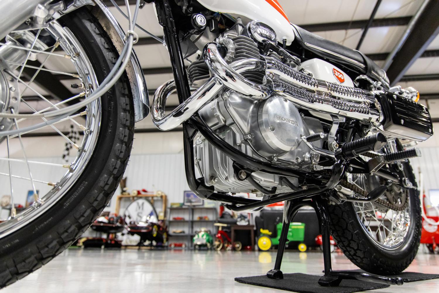 The entire motorcycle was completely disassembled to a bare frame. The frame was stripped and then powder coated black. It's equipped with a center and side stand. It's also equipped with new foot pegs. The OEM headlight bucket, front forks, 2.4-gallon fuel tank and side panels were painted in the correct colors of white and orange. The paint was purchased from Randy Marble who specializes in paint for restorations of vintage Japanese motorcycles only. The high quality paint was recently detailed to a glossy finish by the team at MS CLASSIC CARS. The fuel tank and side covers were decorated with Honda 350 emblems. All of the chrome was professionally re-chromed. The OEM cross-braced handlebar is mounted to the top triple clamp and supports the mirrors and levers. A set of NOS Nippon Seiki instrumentation was added consisting of a 110-mph speedometer and a tachometer with a 10,500-rpm redline. The five digit odometer shows 71 miles. It's equipped with OEM turn signals on the front and rear. It was outfitted with OEM front and rear fenders. The fenders were dressed with NOS marker lights. The rebuilt suspension consists of a telescopic fork as well as dual shocks mounted to the swingarm. Braking is handled by front and rear drums that were completely rebuilt. The front brakes feature a twin leading-shoe design. The motorcycle rolls on OEM DID stamped 18” and 19” wheels that were completely restored including the new spokes. The wheels are wrapped with new Dunlop Gold Seal K70 3.25-19 tire on the front and 4.00-18 tire on the rear. The OEM seat was re-foamed and upholstered with a reproduction seat cover. It was setup with a complete new wiring harness.
