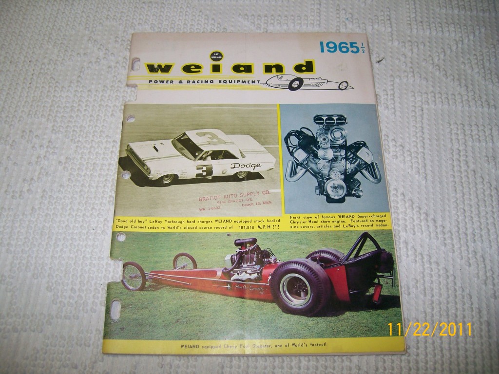 I have a 65 1/2 Weiand (say Why-and) catalog with LeRoy Yarbrough on the cover. It is 68 pages and is in very good condition and full of cool stuff. The price is $125.00 OBO and includes shipping to the lower 48.