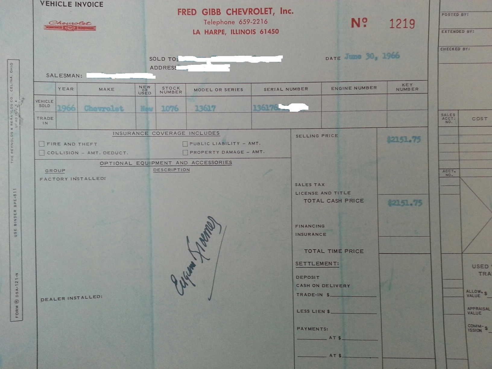 Thought you'd like to see this Fred Gibb invoice from a 66 Chevelle. I have the factory invoice from the car too.