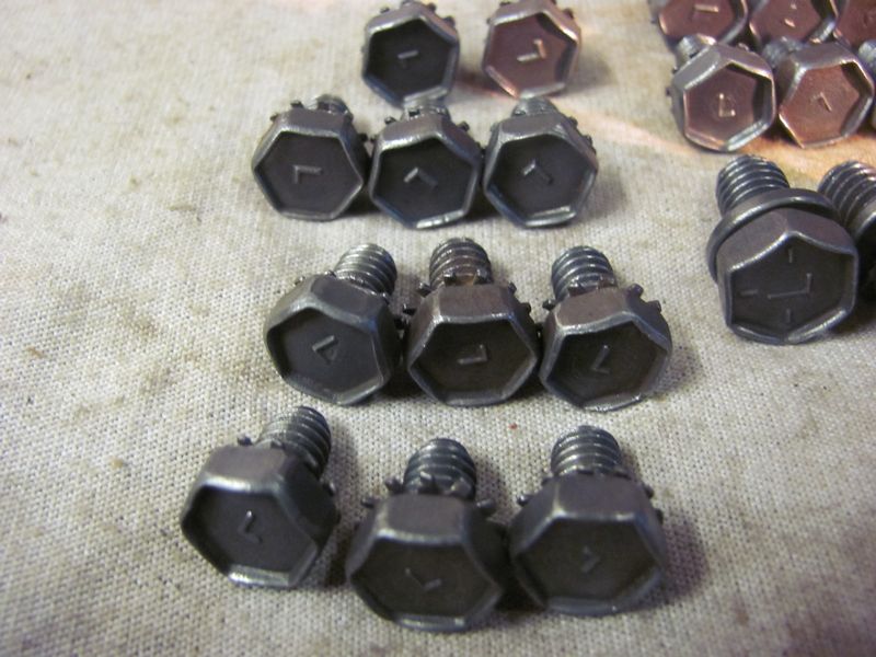 This set is for the LARGE Flag design. 11 Timing chain cover bolts (Flag) 14 oil pan side rail bolts (Flag) 8 water pump backing plate bolts (Flag) 4 inspection cover bolts (Flag) 4 oil pan corner bolts (ELH) THESE HAVE ALL BEEN CLEANED AND ARE READY TO INSTALL ALL WASHERS-STAR AND LOCK SPIN FREELY ITS VERY HARD TO FIND NICE CLEAN COMPLETE SETS 100.00 (2 sets available) |