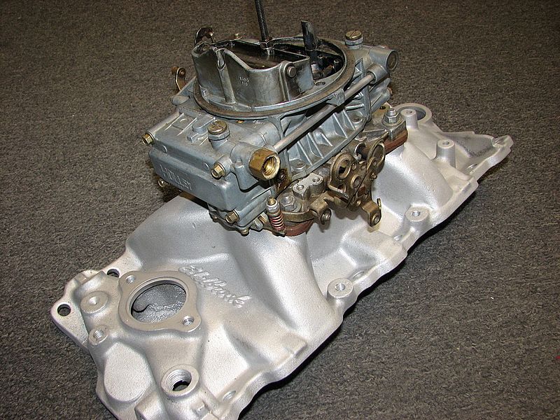 Have a very nice small block Chevy Edelbrock Performer intake and Holley 1850 4 bbl with manual choke. Carb worked well and was taken off to install a 2x4 set up. Intake has no cracks, repairs or bad threads. Nothing is warped or damaged and was just recently removed from a running street rod. Great for your kids first car where they can get some bling without so much cha ching. $150 plus the ride. Will separate.