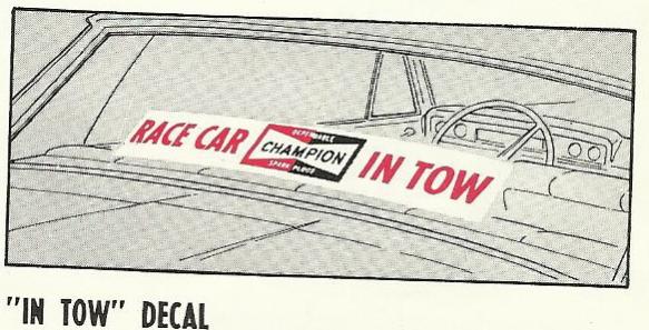 RACE CAR IN TOW- vintage 1960s/1970s style back window decal/sticker. Back in the good old days when everyone flat towed there race car to track , everyone used shoe polish or had a decal in back glass calling out a car being towed. These are accurate in detail too original in size, color and design.Measures 4" x 26". Available in Champion spark plug , Holley carburetor , or NMW manufacturing. These are high quality professionally produced- not a cheap ink jet copy. You will not be disappointed. Limited quantities produced.$11.00 each plus 4.80 shipping - paypal or money order