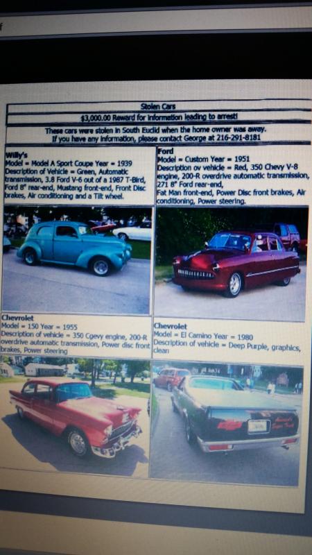 I guess the titles were stolen also and the El Camino has already been titled twice by the suspect(s) in Cleveland. Vehicles may be seen cruising around the area...