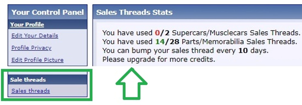 Membership Levels: • Contributing Member annual dues are $30. This membership includes 30 classified ads total per year, including 2 vehicle ads. Once you post a classified you can’t add additional items after initial listing. You can edit your listing for correction or clarification. • Premier Member annual dues are $60 This membership includes 60 classified ads total per year, including 2 vehicle ads. Once you post a classified you can’t add additional items after initial listing. You can edit your listing for correction or clarification. • Advertising Member annual dues are $125. This membership includes 125 classified ads total per year, including 3 vehicle ads. Once you post a classified you can’t add additional items after initial listing. You can edit your listing for correction or clarification. Noted changes: • The originator of the ad can bump their ad after 10 days. The bump icon is only viewable by the originator.. If you select the bump icon prior a prompt will show the remaining day until a bump can be executed. See Illustration below. • The originator of the ad can now mark an item sold. The sold icon is only viewable by the originator. If you select the sold icon it is moved to a sold archive folder, so only active ads are viewed. The sold archive folder is viewable and used as a historical record. See Illustration below. • Members can post a comment on other members ads, and no longer inadvertently bump ads. In the past we discouraged commenting but that is no longer an issue. Members posting on other ads should contain questions seeking information and as always no bashing due to price. If something is mis-advertised pm a moderator. • Classifieds threads will now have a photo. This photo is the first photo the originator uploads. User CP (Control Panel) New Features • There is a new option at the bottom Sales Threads. If you select that icon it will show all you past and present sales threads you’ve originated. It’s a handy feature when searching for items you’ve sold. • There is now a sales post indicator at the top of the Sales Thread screen, which displays the # of sales threads you’ve posted/used and the total originally available based on your membership level. The illustration shows I’ve used 28 out of 30. I have two sales post left. **Adding classified ads. If you run out of classified ad posting, you can purchase a new membership (Contributing 30 ads, Premier 60 ads or Advertising 125 ads) your old membership will be canceled without refund of any remaining time. A new membership will start, with as selected classified posting privileges along with new anniversary date. The cost of an ad is still $1”” ***The above memberships are offered to non-commercial entities*** Sponsorships are available to Commercial Entities. We have many options and features that can be configured to meet your budgetary and promotional requirements. More details such as levels and options are located in the Sponsor Forum. Sponsors can place 5 adds per day (unlimited if listing in your exclusive forum). Sponsors can bump their ads every 3 days in the general classified forum. Vehicle classified ad total listings vary based on the selected metal package. As always I appreciate your support and look forward to our latest feature My Garage & Journey to launch following this implementation. The changes are newly implemented and if you have questions or encounter issues, please PM or email [email protected] and I will try to address expeditiously. Illustrations below: *First picture illustrates the ad originators Mark Sold & Bump icons *Second picture illustrates the sale ad status counter located under UserCP (Control Panel) in the Sales Thread option. *Third picture illustrates all Sales Threads you originated, both present and past. Best regards, Steve Shauger