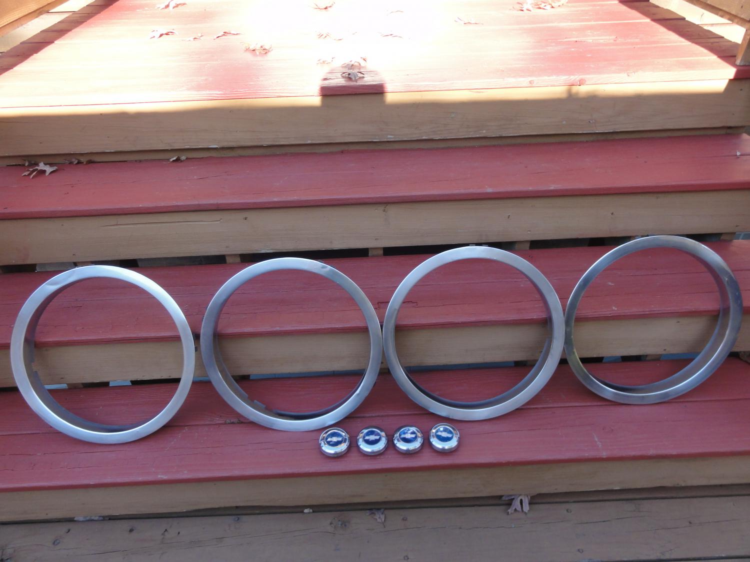 Original 1970 Z28 camaro Wheels,Tires ,Trim rings ,raised bow tie Caps. These all came of this car. They were stacked in a basement for 49+ years. Wheels are dated 2(4-21) 1 (4-22) 1 (4-23) small valve stem hole 1 year only. Wheels still maintain original paint . The back on one is pitted it was at the bottom of heap took all the moisture. Cleaned it a little and primed it to stop any further rusting. Trim rings are first design . one has slit to accommodate wheel weight they have a few dings .The raised Bow tie caps are in decent shape. Tires are original F-60-15 ,but not road worthy.May be used for display only. 2400.00 Can ship at Buyers expense .