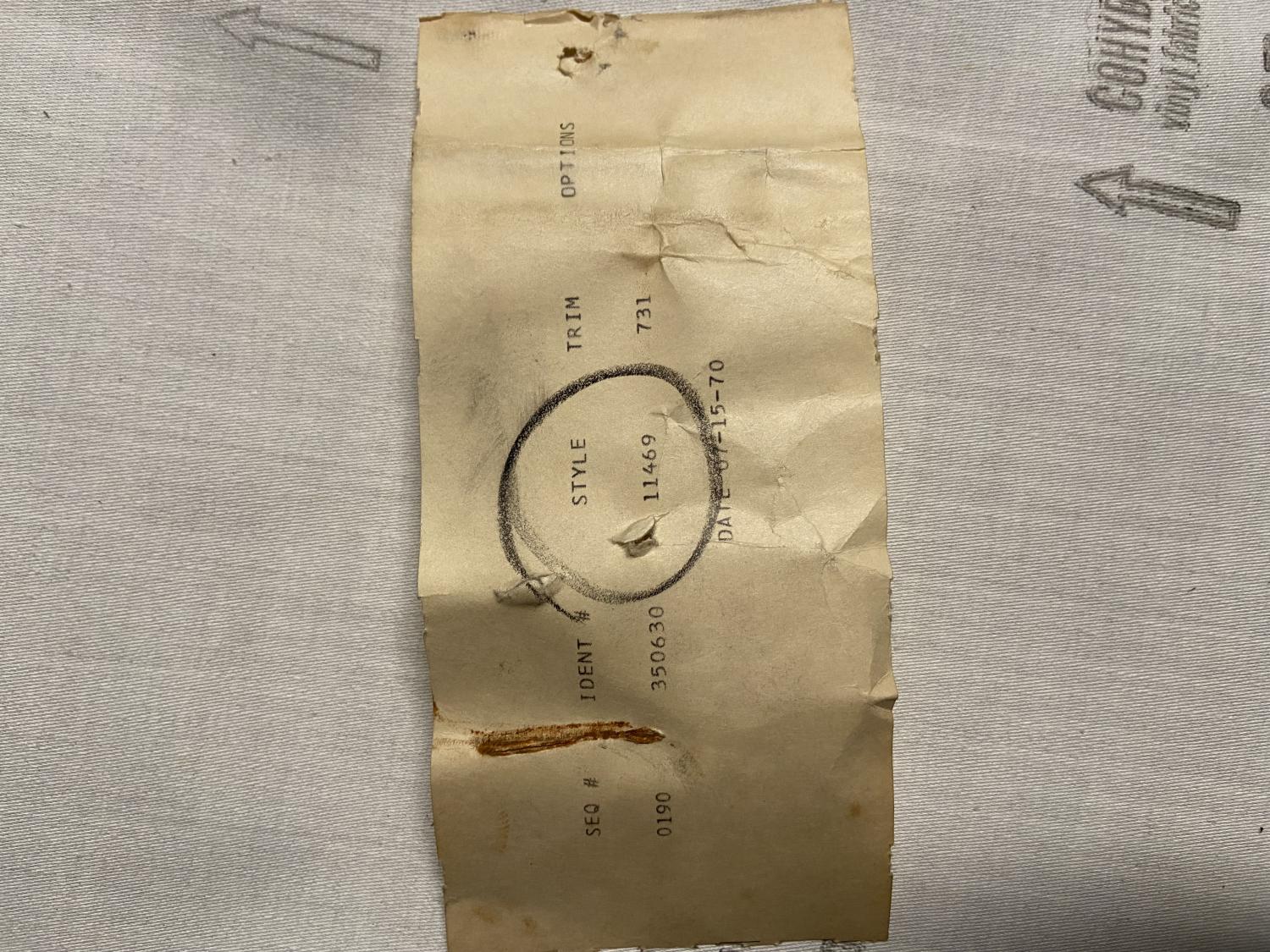 These covers are off the REAR SEAT. TRIM CODE 731. Black in color. Super Nice and the correct pattern for 1970 only. Would be perfect to use if you have original black 731 trim code seats that need sections repaired or replaced. Here is FACTORY ORIGINAL material for you or your trim shop to do it with. Some creases from being rolled up and kept in a box, but they will smooth out . Vinyl is soft/pliable. Backs are super clean. See pics for details and factory markings. Computer card dated 07-15-70 Shipping to lower 48 United States mailing addresses only. Payment by PPFF or US Postal Money Order only. Price: $125.00 shipped PM with any questions Thanks for looking John Last edited by nuts4novas; 01-28-2022 at 10:36 PM. Reason: Price drop |