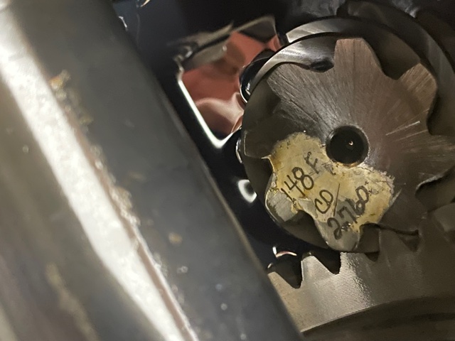 This rear was in an old drag car. According to the assembly stamp, it started life as 3.55 posi. It does have the traction bar bracket. I took the cover off, and this is what I found. Just judging by turning the pinion - I'd estimate 4.88 gears.