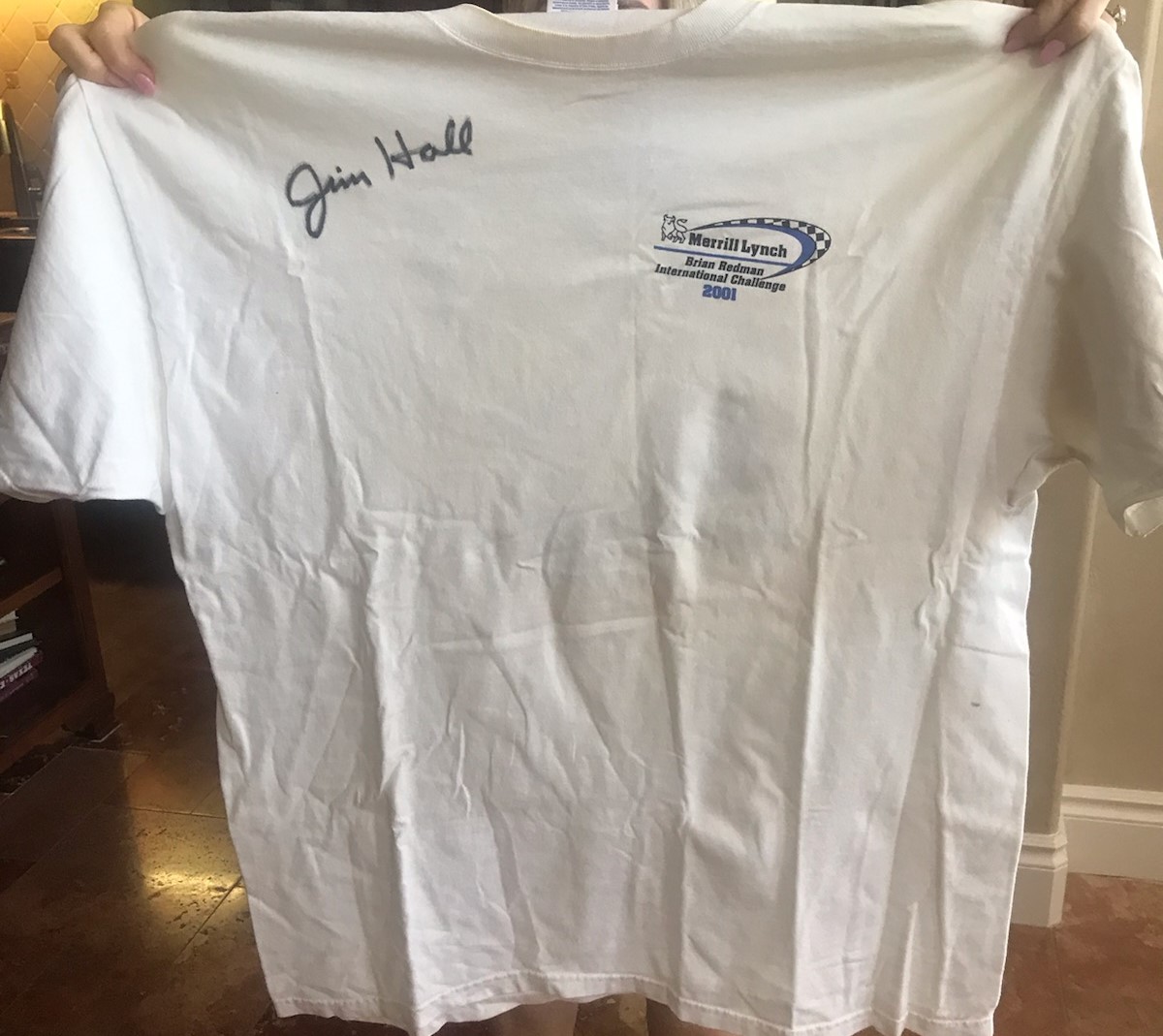 A friend of a friend worked for Jim Hall in the 60's and offered to have Jim sign a shirt that featured his cars at a Road America event in 2001. The line to have Jim sign the shirt was at least one hour long 22 years ago so the offer was made to send the shirt to Jim for his signature. It just arrived back in my hands today......