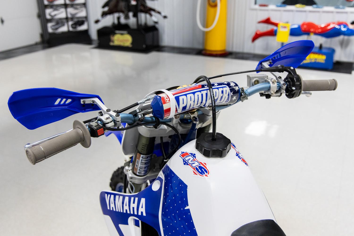 This 29-year old 1995 Yamaha WR250 is an outstanding example of a seldom-seen model on the vintage restored market. It was the product of a meticulous restoration by expert John Chang of Moto Scrub located in California. This no expense spared build is fully documented on a You Tube video. It was completed on August 22, 2022 with only 0.2 hours run time on the new Hardline Products hour meter. As the build sticker on the front forks indicates it was built for rider Ryan Peterson. The entire frame was stripped and powder coated blue. The frame was outfitted with new IMS Pro-Series foot pegs and a new Devol aluminum frame guard. The original two-stroke 249cc engine was completely rebuilt with new OEM parts. This engine was rated with 49.8hp from the factory. It's equipped with new VForce reeds by Moto Tassinari. The original Mikoni VM38SS 38mm carburetor and 5-speed transmission were completely gone through. The engine is liquid cooled and has new Devol aluminum radiator guards. The engine breathes through a new FMF Gold Series Fatty pipe which is carbon steel with a nickel plated finish for durability. The pipe is attached to a new FMF Turbinecore 2 spark arrestor. The seat has new foam and black cover. The original fuel tank was cleaned and reused. It was outfitted with all new UFO plastics and miscellaneous decals which are removable. It's equipped with new Pro Taper handlebars, pad and soft grips. The handlebars are setup with a combination of a Scotts and Ohlins steering stabilizer. The Cycra blue hand guards match the blue front fender. It rolls on new Takasago Excel blue wheels with restored hubs. The wheels are wrapped with new Dunlop Geomax tires which are 80-100-21 on the front and 120-90-18 on the rear. It's equipped with new Vortex spockets, DID 520 gold chain and carbon fiber chain saver. The suspension has an OEM stack. The front forks and rear shock were setup with new Race Tech Gold valves. The front forks have white plastic covers and seal savers. It was setup with all new single disc brakes throughout. It's equipped with a factory kick stand. A new Factory Effex Yamaha stand is included. This is a great opportunity! From the MS CLASSIC CARS Collection.