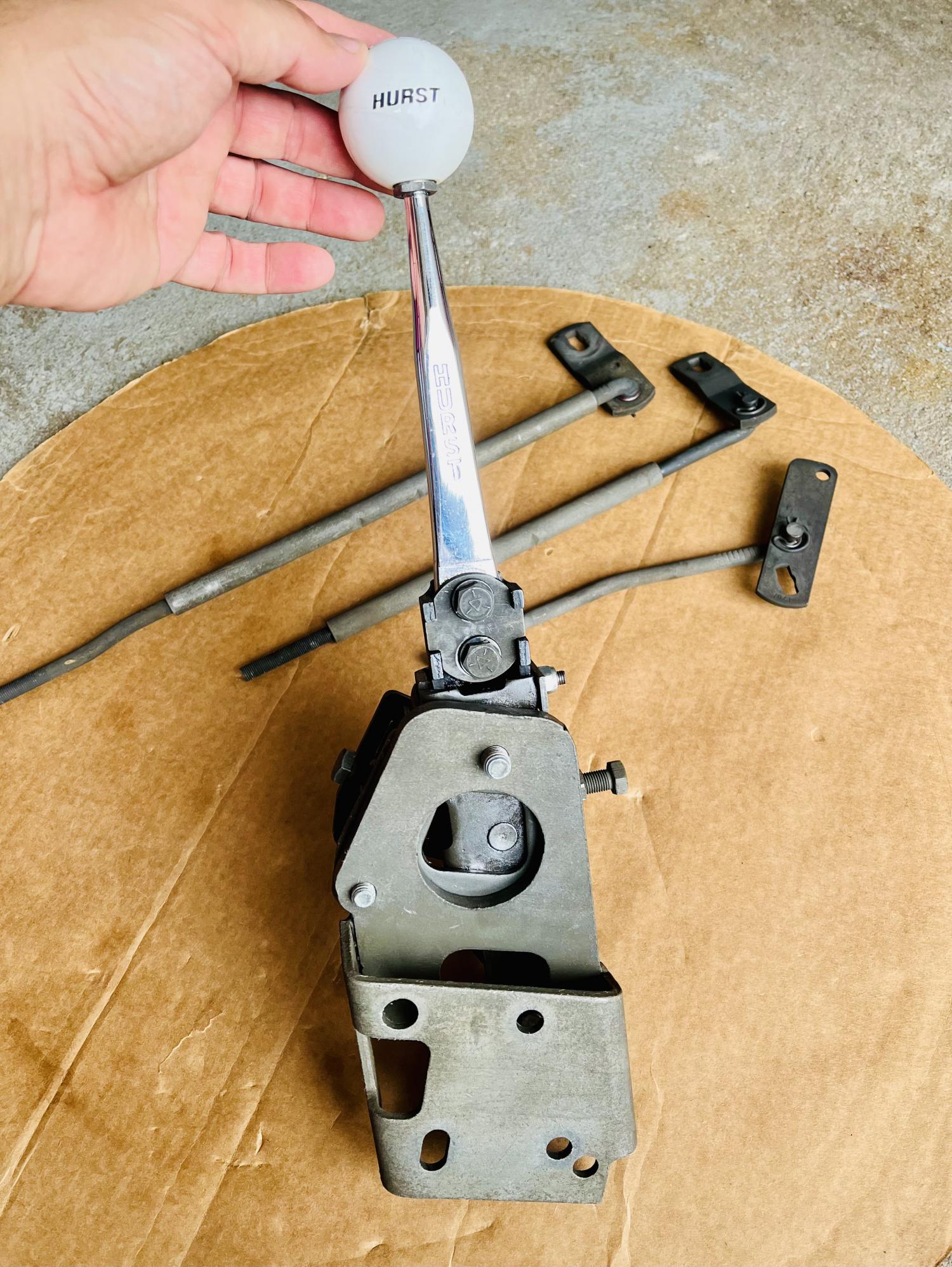 Hard to find Hurst Super Shifter 2 with push down reverse, part number 4918777. It’s been completely gone through; new hardware was added as well as a Hurst pit pack with steel bushings. It comes with the mounting bracket, sleeved straight rods, levers, chrome stick, and shift knob. The shifter itself is universal and will work on most 4-speeds. The mounting bracket, rods, and levers will work with Muncie M20, M21, M22, or Borg Warner T10, Super T10, among others. $475