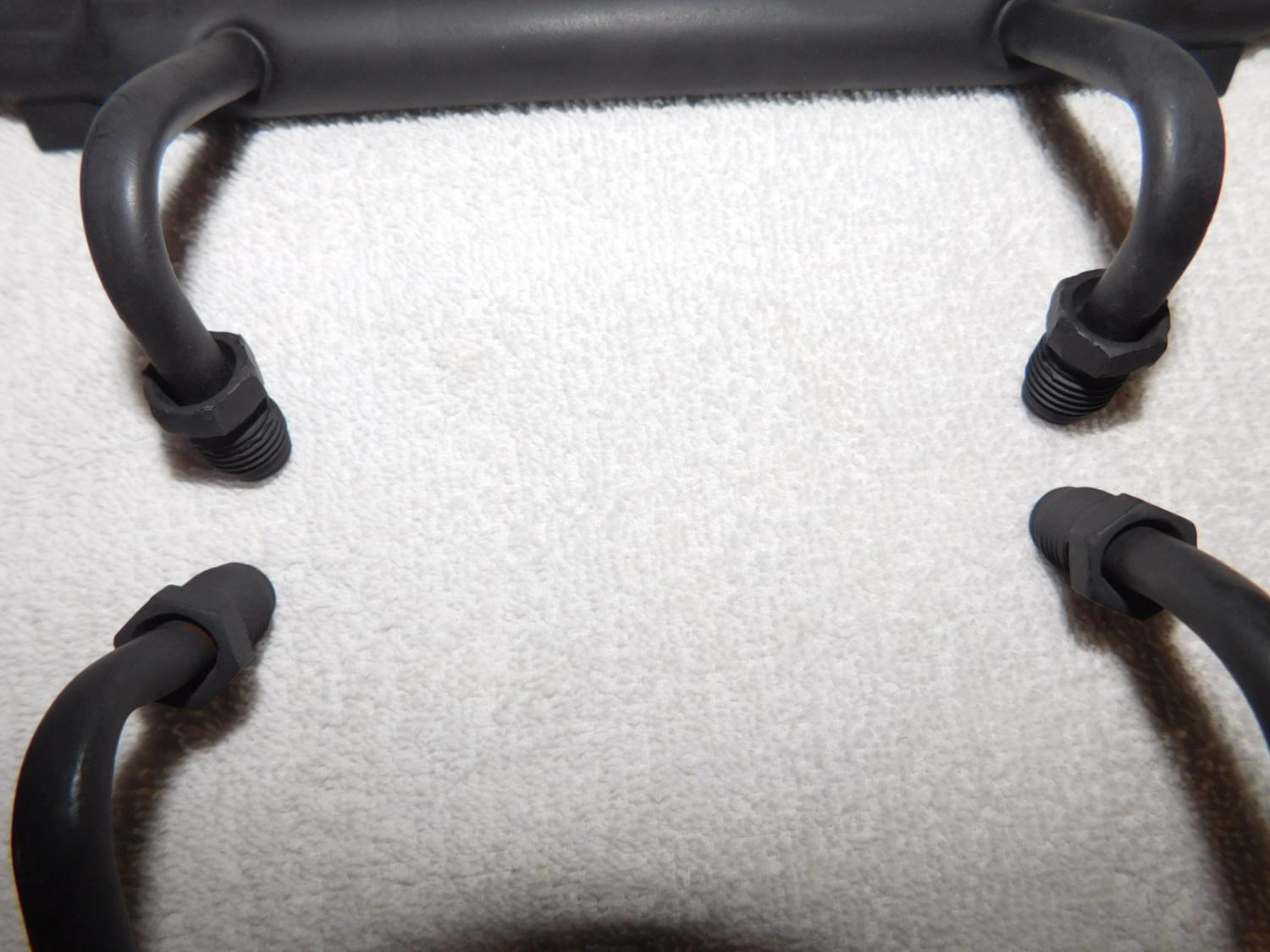 Original Corvette 454 air injection/smog tubes. These are the later variation with the crimped transition from the large pipe to the small pipe. All threads and nuts are good. These can be used on 427 and 454 engines. The left side pipe was also used on other GM BB engines.