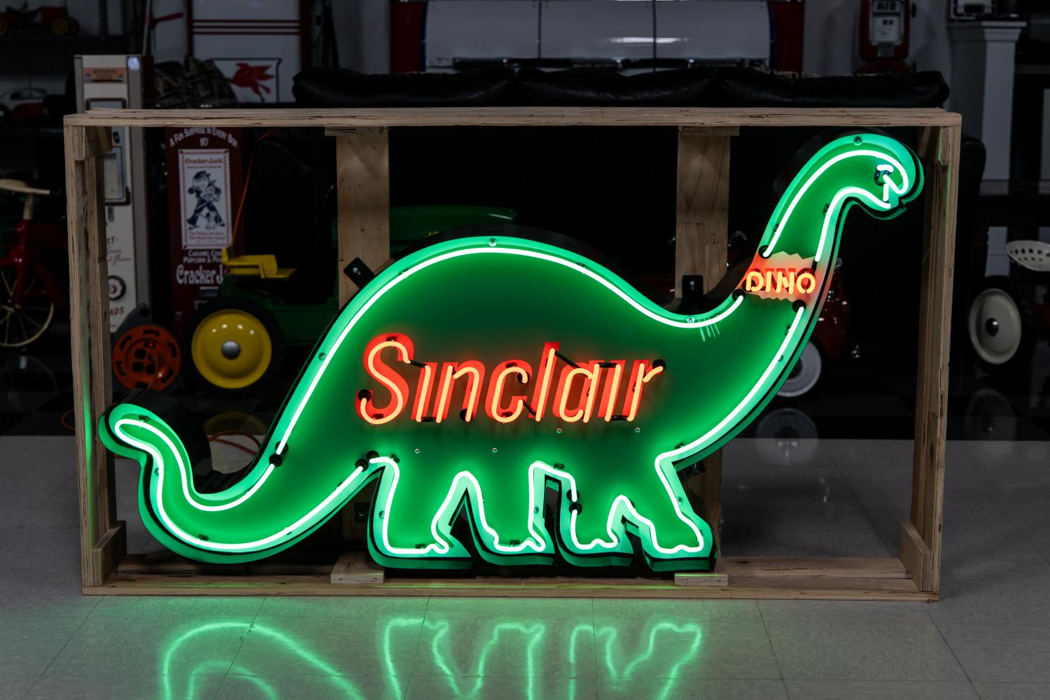This super Sinclair Dino Neon Sign is an attractive and fun display piece. It's in new condition with original plastic around the base. It has the original Sinclair Oil Corporation Officially Licensed Product sticker on the backside. The Sinclair Oil Corporation was an American petroleum corporation founded by Harry F. Sinclair on May 1st, 1916. The corporate logo featured the silhouette of a large green Brontosaurus dinosaur, based on the then-common idea that oil deposits beneath the earth came from the dead bodies of dinosaurs. Sinclair was ranked as one of the largest privately owned American corporations. It owned and operated refineries, gas stations, hotels, a ski resort and a cattle ranch. The company had multiple acquisitions and name changes over the years but is still operational today. The corporate logo featured the silhouette of a large green Brontosaurus dinosaur, based on the then-common idea that oil deposits beneath the earth came from the dead bodies of dinosaurs. The Sinclair “Dino” brand symbol is iconic and recognizable across America. The metal front fascia displays the Brontosaurus dinosaur in green with a white border. The Dinosaur was outlined with white neon. The Sinclair company name and the name Dino is red. The names were outlined in red neon. This is a really fun sign that even children appreciate! MS CLASSIC CARS purchased this sign in January of 2025 and April of 2025 is the first time it's been listed for sale.