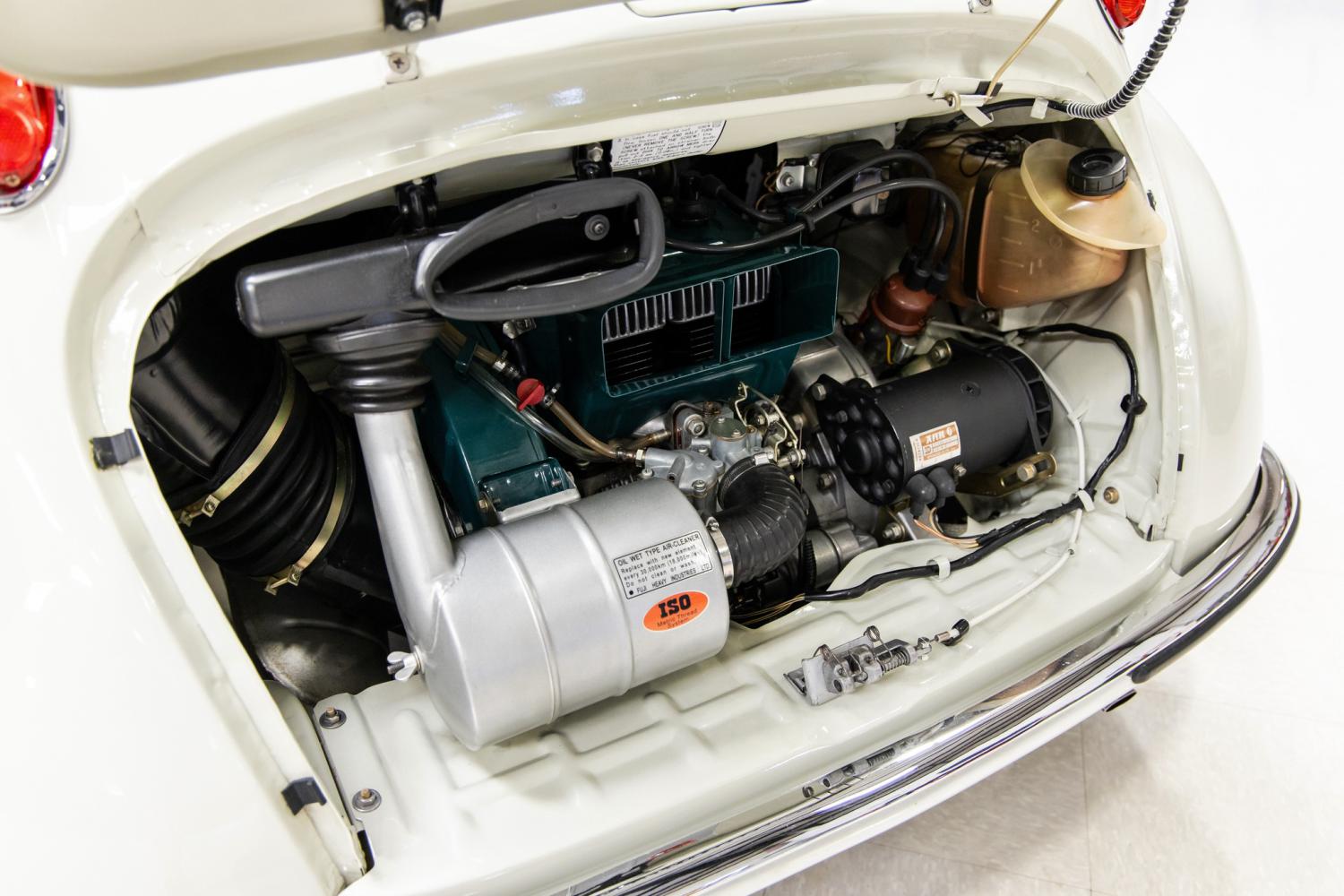 The engine compartment is highly detailed throughout. The entire bay was also stripped, prepped and repainted cream. The car is powered by the rear-mounted two-stroke EK32 356cc air-cooled 2-cylinder engine that was factory rated with 25hp at 5,500 rpm. The factory original engine was completely rebuilt during the restoration and runs excellent. The engine breathes through a new exhaust system and has a sweet sound. The power is sent to the rear wheels through a four-speed manual transmission.