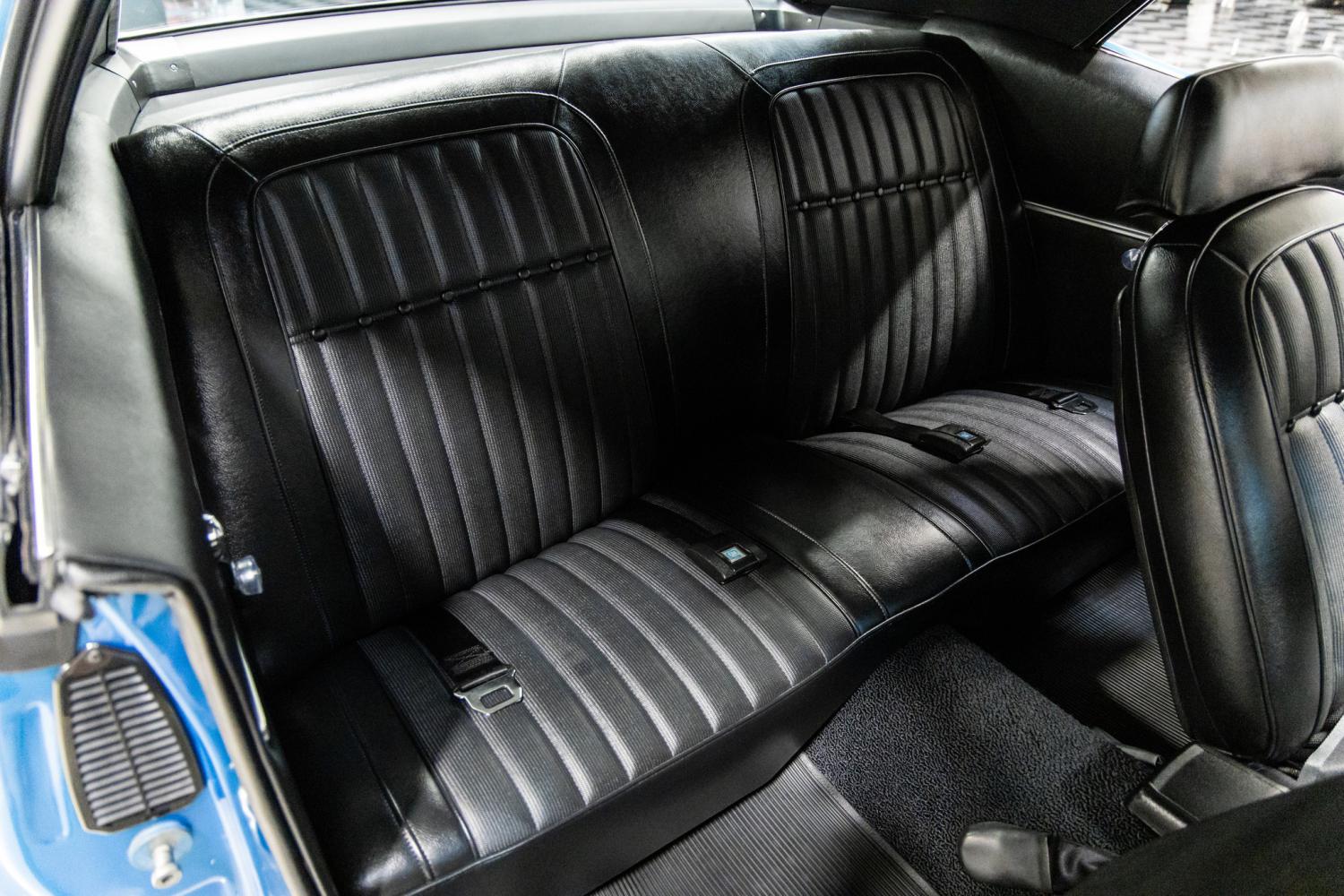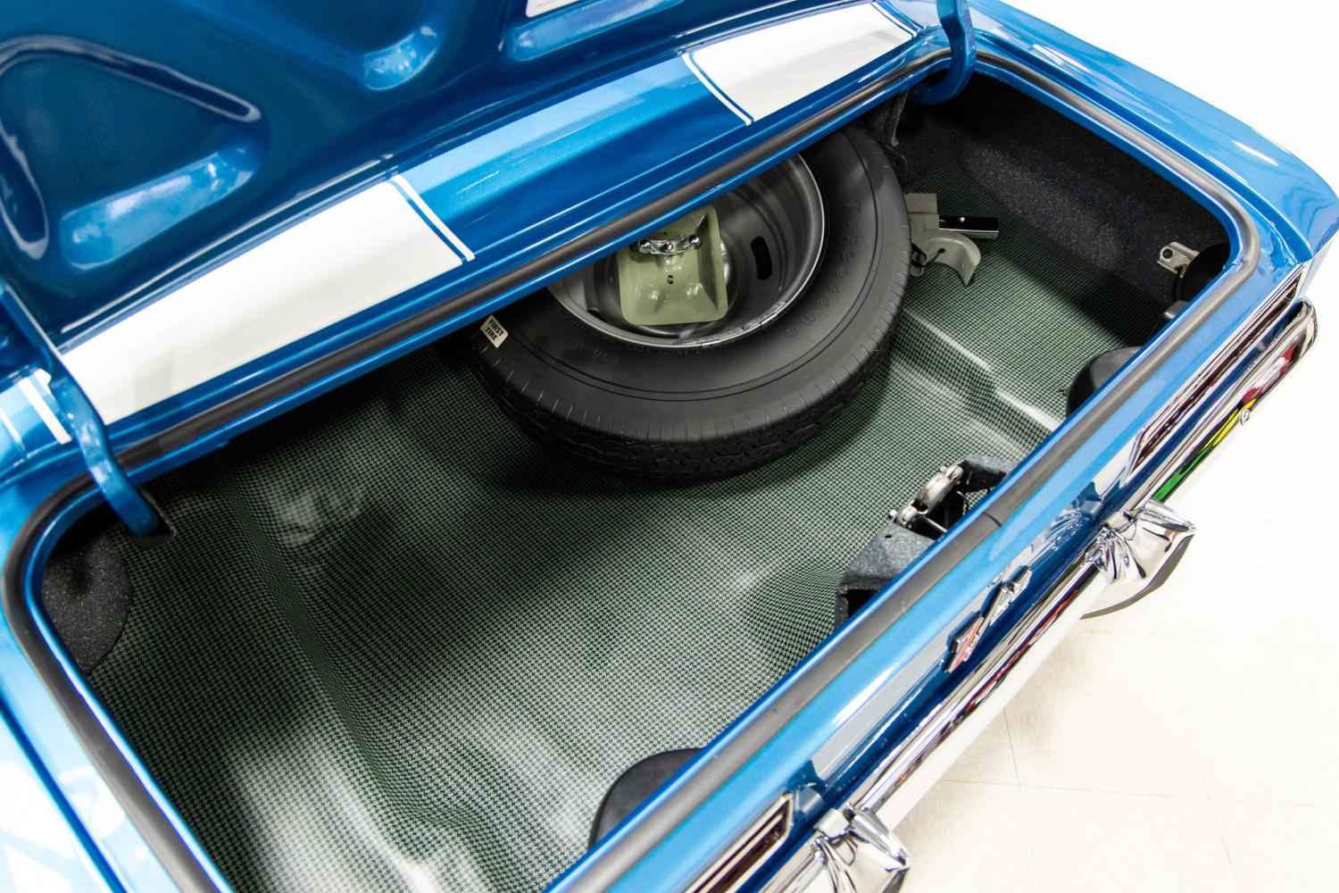 The interior of this car is also in beautiful condition throughout. It was stripped to a bare shell and reassembled. It was refinished in its original black deluxe trim (Code 712) with simulated wood accents on the dash, console and steering wheel. Some of the deluxe interior features include the comfort weave upholstery, molded door and rear panels, grab handle and headrests. During the installation of the new upholstery extra padding was added for comfortability. The interior is the perfect blend of luxury and sport. Everything in the interior was restored or replaced new including the headliner, dome light, rear view mirror, dash, gauges, heating controls, radio, steering column, steering wheel, console with gauges, Hurst shifter, door sill plates, door hardware, seat belts, pedals and carpeting. It was recently outfitted with new correct style black rubber floor mats. The trunk compartment was completely restored and refinished in the correct style splatter paint. It was outfitted with a plastic trunk mat. It's equipped with a new full size spare and jack tools that were installed by MS CLASSIC CARS.