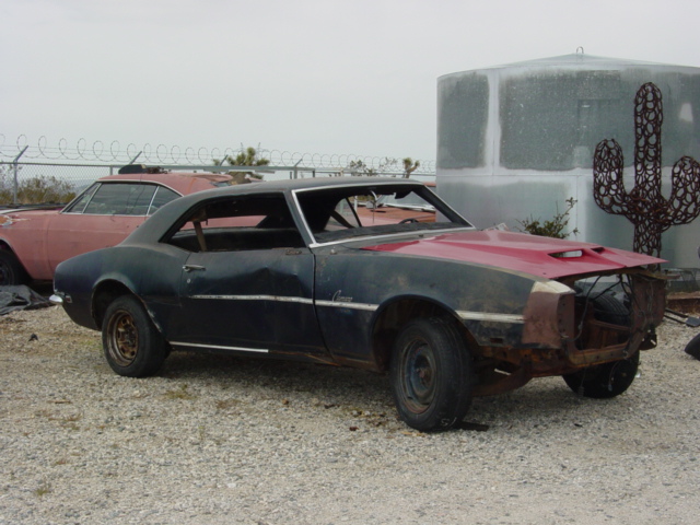 The car was owned by a sailor in the Navy stationed in the San Diego area. It was originally purchased at Jay Kline Chevrolet in Mn. I do not know how it came to Calif., but maybe him being in the service had something to do with it. The person in San Diego owned the car until about the mid 80's. I do not know how long he owned it before this time or if he was the original owner. Sometime in the mid 80's he took parts off of the car and called a wrecking yard and had it towed away. Bad move. It was actually on the back of the wrecker on it's way to the crusher when a couple of young guys stumbled across it parked in front of a fast food restaraunt, luckily the truck driver got hungry just at that time or the car would have been lost forever. The guys recognized the badges and realized the car should be saved and made a deal to buy the car on the spot for cash, cheap. The driver dumped the car on the spot and it was dragged home. Later, one of them needed transportation and traded it for a $1700. running car, believe it or not I think the car was a mustang. That is how the guy that I bought it from acquired the car. He took it to the desert and covered it and there it has remained until now. Some interesting notes about the car. When my seller got the car it had most of it's external badges intact. He was going through a divorce and actually took all of the badges off of the back panel, fender and glove box so the car wouldn't be taken by his ex-wife. That is why you can see the outlines of the badges on the car. The badges are in his garage somewhere. They were pretty crusty but we are going to find them. The car is in not bad condition considering it's been drag raced hard and sat in the desert for the last 20 years. There are a few small rust holes in the drivers front pan and the rear fender lips are messed up from big tires. The paint on the car is original including the stripes. The drivers side fender is missing. The hood was gone but my seller acquired an orig. after years of searching. It has the 140 speedo, big front swaybar, Yenko door jamb tag, Yenko type cowl tag and the seller is digging out the tach and sending unit, along with some other parts he stowed away. You can see the holes in the cowl for the sending unit. The car has a dash dash paint code on the tag but is painted Deepwater Blue. A 67 color. This was also verified by Vince Emme over the phone. The interior was std black. The Yenko tag on the fenders is over the old SS holes, not above the Camaro emblem. There was no raingutter trim or top of the door trim. The rear panel was never black. It did have a SS gas cap. It did not have spoilers. It came with PS and PDB. I and a few others have known about this car for years but I happen to be talking to the owner when he said he wanted to sell it. After a couple of weeks of talking we struck a deal. The car is now in my garage awaiting restoration. When I got it home I opened the trunk and there was a live rat still living in there. There is a picture of him to follow. He is now with Don Yenko. We dubbed the car The Desert Rat. If anyone recognizes this car or has any information about it's history I would be greatly indebted to them. There is still a Navy sticker on the back lower part of the car. I am a Bowtie fanatic and I am glad to bring this car back and put it in it's glory. Sorry I ran long but I know people like the story. I tried putting a pic but it was a little too big.