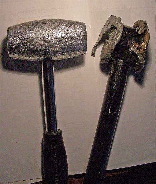 The lead hammer furnished with the car is for one-time emergency roadside use; you need a "Muther-Thumper" REAL lead hammer. Google "Muther-Thumper" and you'll get hits on where to order one - all the Cobra guys (and experienced Corvette KO wheel guys) use them. Photo below of the "Muther-Thumper" on the left and the hopeless one-time-use hammer on the right.