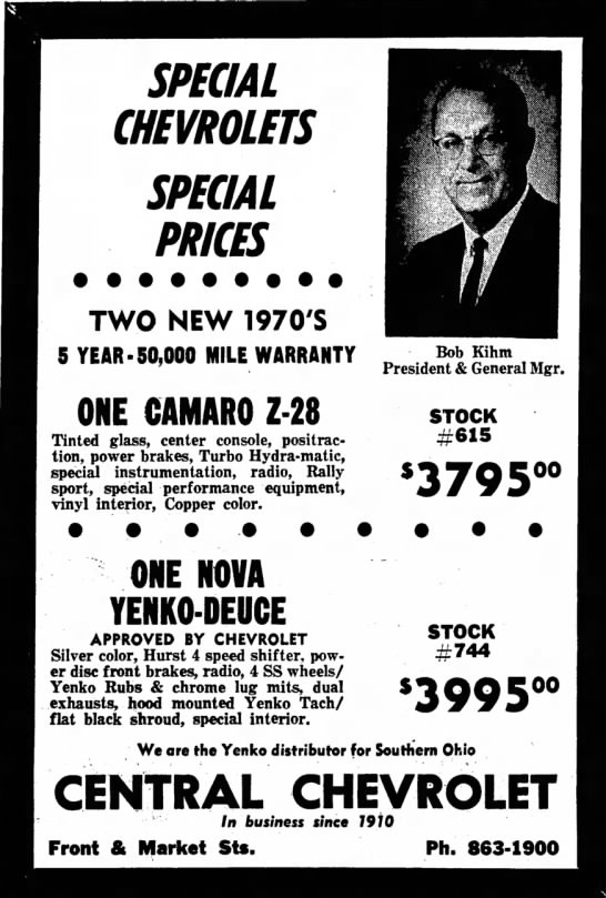 ----Wonder how close Bob Kihm Chevy was to Konner Chevy? My 67 Corvette came from Konner but the original owner was from Hamilton......Bill S