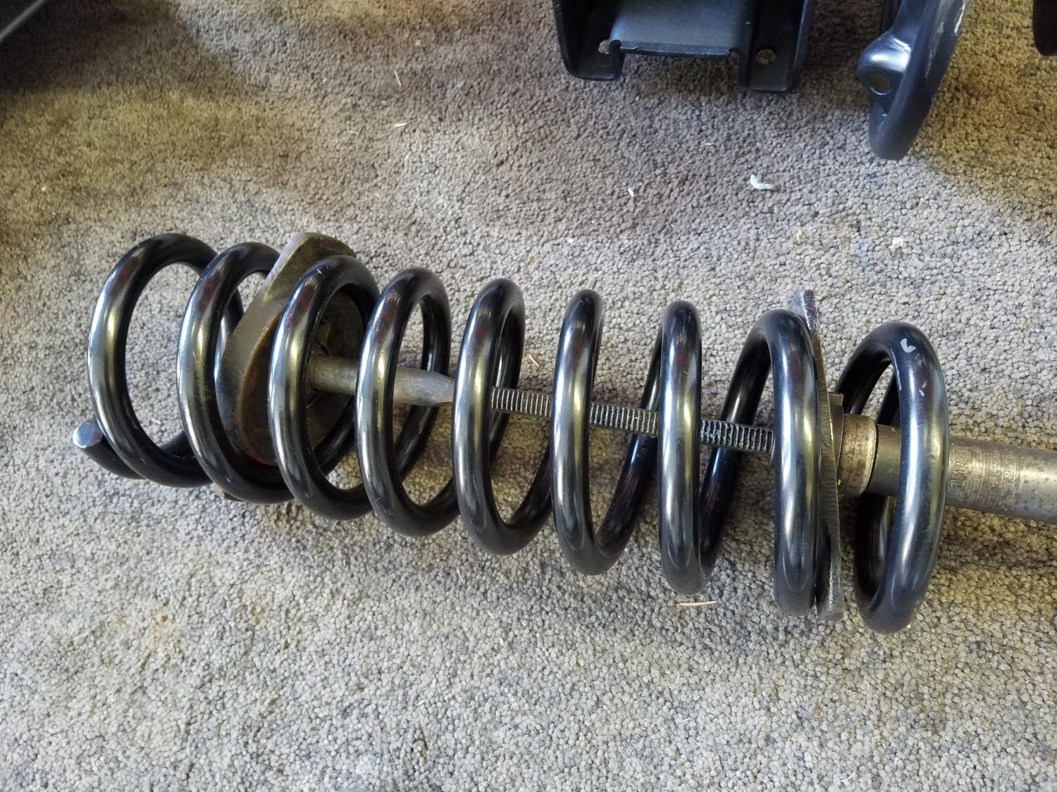 Once you have the ball studs loose, remove the shock, you can do this before breaking the studs free too... and insert 36" of 1/2" diameter all thread rod thru the shock mount hole at the top and thru the bottom of the lower control arm. You'll need a thick plate on the bottom... 1/2" would be safe. Double nut the rod on the bottom, so it can't turn and then tighten a nut on top of a heavy washer on the top side of the all thread until the bottom stud nut can be easily removed. Once you have the nut off, start turning the top nut out, so the spring extends, until it is loose in the lower control arm. You'll need to have 18-24" of space under the car for the spring to extend before it will relax. Once that happens, remove the all thread and the spring and remove the top stud nut and the spindle is free. Observe how the spring rests in the lower control arm for re-assembly. The top of the spring will be wound and ground flat, while the bottom has a pig tail that needs to be clocked into the recess in the lower control arm. Not a big deal to do, but I've seen many people not pay attention to that and have the spring bound up and curved against the shock.