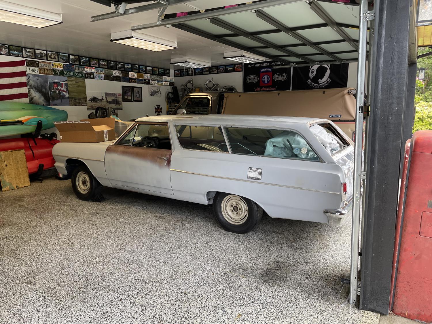 Factory V8, power rear window and A/C car. Mostly complete except for engine, transmission, radiator, carpet, headliner, door panels (cargo panels are intact). Some rust below tailights but, fairly solid elsewhere. Someone started installing front floor pans. Needs finish welded. Doors are excellent. Fenders and hood are nice. Quarters have lower patches and still need body worked/block sanded etc. Sliding window channels are solid. Spare tire well solid. Factory turquoise with white top and turquoise interior. Fremont built lifelong west coast car. All 2 door specific moldings intact (side moldings and window moldings). Obviously this is a project but, fairly rare even for a 2 door wagon since it was a V8 and A/C car. Moving out of state. Have had it for a year.
