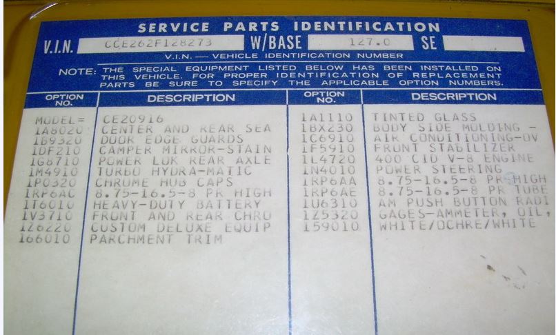http://chevellestuff.net/qd/terminology.htm Those are the codes with two letter characters. Sometimes an option, like 3.55 gears, has a dozen ECL codes, all signifying a different application (possibly engine, tranny, and maybe something else). I don't know much about this but this is what I have been able to gather. There probably is a key that shows what each of the codes mean, but AFAIK a few Corvette folks have that key and haven't shared it with anyone. But it's the reason why Corvette info exists, while other Bow Tie vehicles have scant information. |