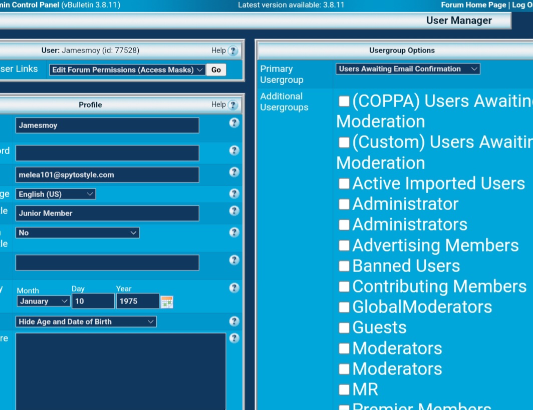 I attached a screen shot of status of jamesmoy. He's in the inactive "users awaiting email confirmation " group.