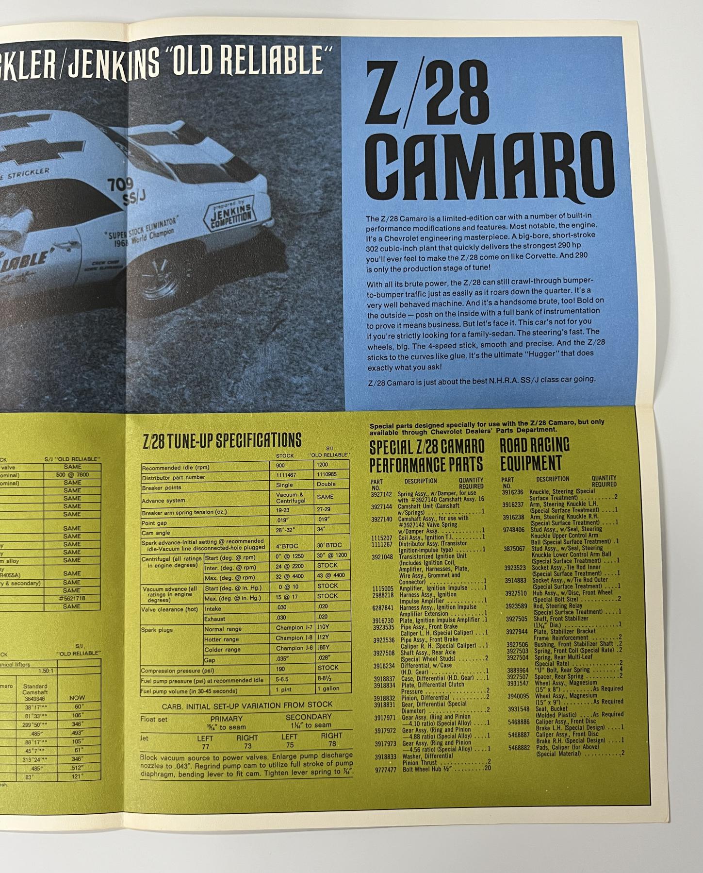 The poster features tech info like Z28 Standard Performance Features, Engine Data, Valve System, Z28 tune up specifications, special performance parts and road racing equipment. The hand out (reverse side) offers a quick bio of Dave Strickler and Bill Jenkins along with great graphics from the Strickler/Jenkins Chevy Hi-Performance Clinic. 20x15 in size.