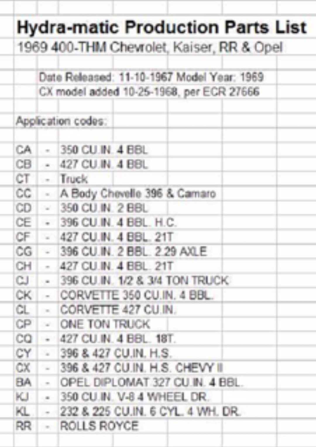 TH400 Code Format: yyaddd yy = last two digits of the model year a = transmission application C = L35 engine E = L34 engine X = L78/L72/ZL1 engine ddd = Julian day of model year 68C493 = Day 127 or May 7, 1968 for L35 Nova / Camaro SERIAL NUMBER Ca-69-nnnn e.g. CX-69-3470 where: C = Chevrolet X = L78/L72/ZL1 engine 69 = model year nnnn = 4-digit production sequence number The new trans were coded 68Y534 with serial # CY-68-10xx, etc. But what Willow Run put on the POP was the CC trans, which was the L35 trans, ignoring the CY. And despite the 534 day on the trans, they put 103 as the date. So 68C103 on the POP instead of 68Y534. Sometimes the plant used the correct day, but the POP still showed the wrong trans model. All of those POP above should be 68Y5xx. I can't explain. It wouldn't be for tracking purposes, that was implicit with the new trans code. I noticed this before, but didn't have enough data to see a pattern. Thanks Bill! Ray - does your car / #37 have the original trans tag?