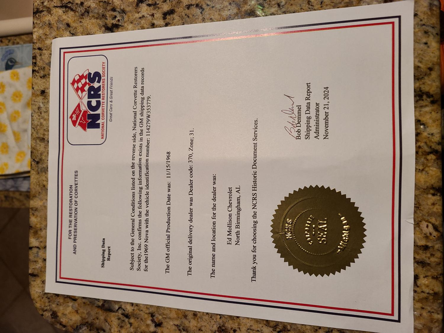 I did send off for the shipping dox from the NCRS and the car has a production date of November 15, 1968 (which coincides with all the dates on the car) and originally sold out of Ed Mollision Chevrolet in Birmingham, AL. I thought it was pretty neat to find out the car was an Alabama car and after going who knows where, it is BACK in Alabama.