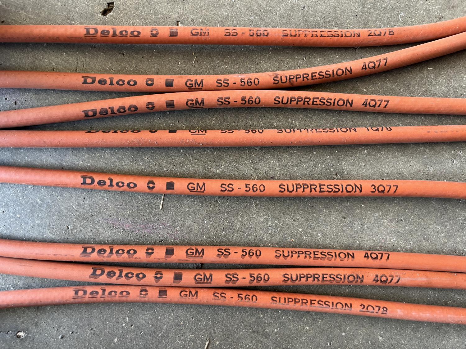 I have an NOS original "cut to fit" set of GM AC Delco SS560 / SS-560 - suppression (anti-static core) - orange HiPo RACE spark plug / ignition wire set. Unlike these, the SS550 / SS-550 marked ones are the 7mm stainless steel conductor wires, FYI. The box is dated 1-78 and the wires themselves are ink stamp with several dates as noted below. These are a must have for your Day2 (and beyond) car or street freak or race car or tribute... very hard to find and nicely dated around 1978 - the height of the street scene, or so I've been told. Super rare and hard to find; these have been waiting their turn for over 47 years! Looks like the box was opened, the coil wire started maybe and then the set was abandoned. Part number 8914475 Group 2.239 #SS-561 Ignition Set No boots, no ends, just the wires as shown below. No original instructions, but I have a photocopy of them. Yard stick included in photo only for scale - not part of this listing of course. Not getting any easier to find by any measure... this stuff is drying up each day... Did Motion use these? Did other tuners? I bet so! And all the cool kids too. Nominal lengths and dates are: 55" 4Q77 49" 4Q77 45" 1Q78 40" 3Q77 35" X2 wires 4Q77 30" X2 wires 2Q78 19" coil wire 3Q77 As soon as you open the hood, BAM, these are right there - be seen with these at cars & coffee next week! It's the details man... And, if your car has a radio - these suppression type wires are the ticket. Cheers Friends, Anthony |