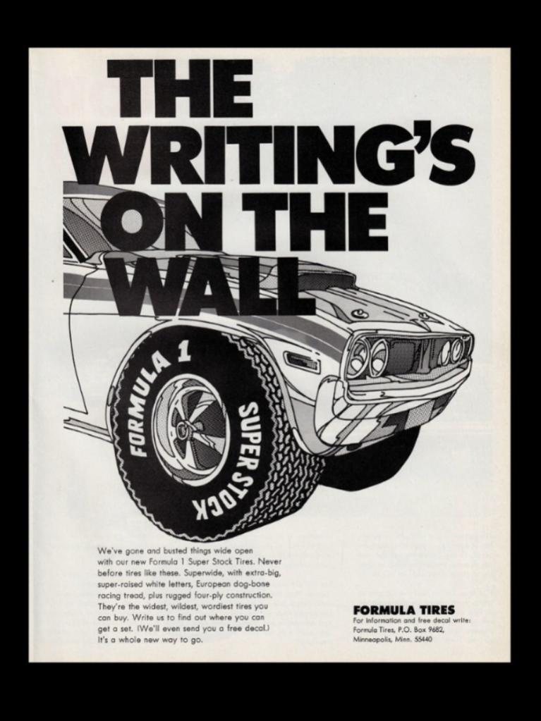 A pair of Formula 1 Super Stock L60-15s. Never driven on, supposedly mounted once. Nibs still on the sidewalls and tread .Still has some of the protective blue coating on the letters and bead that can bee seen in the pictures. One scuff on sidewall that you can barely feel with your finger (im not going to try to clean that up.). Perfect for your Day 2 car for shows or for MCACN. they are nice and pliable with absolutely no dry rot or cracks anywhere. personally I would have no fear of driving on these.