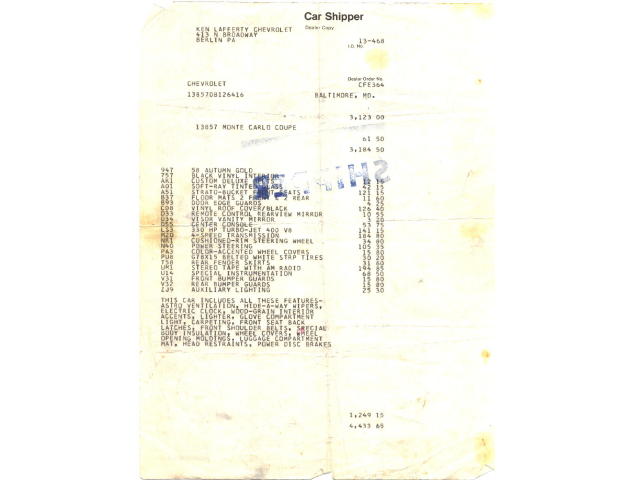 The engine code/Suffix looks like V0319CRE, which is according to www.chevy-camaro.com is a 350/300 horse car, but it also shows a 4 barrel application for that code. Here is what is unusual, it is a 2 barrel air cleaner, and I am sure that it had a 350/300hp sticker on it? I guess the only rational explanation is that the intake was changed sometime in the past? Where were the build sheets in Monte Carlo's (if they are regularly found?) Rich |