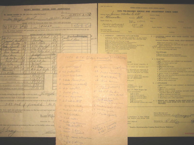 original order form and delivery checklist, the scrap piece of paper is the scrap piece from 4/70 when the original owner made a wish-list and walked into the dealer with it to order the car. that is unbelievable!!