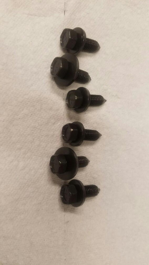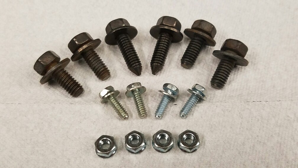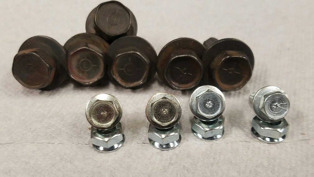 67 369 Camaro front spoiler mounting hardware. Restored excellent condition. The four small cad bolts have anchor head marking while the four larger bolts with flat tips have E in a circle for their head marking and the four long bolts with a pointed tip have an E for their head marking. Extremely nice condition. $80. ***************SOLD***************