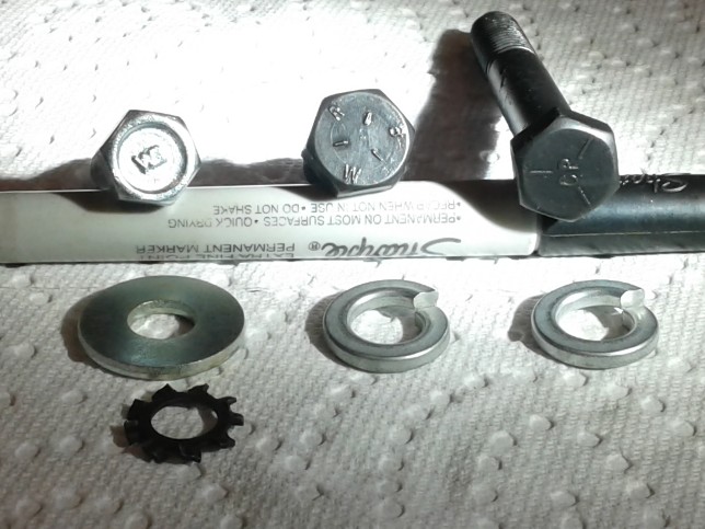 68 69 Camaro rear axle snubber to frame rail bracket mounting bolts set. Excellent original restored pieces. Both small and large washer bolts have E head marking. $60. Two sets available.