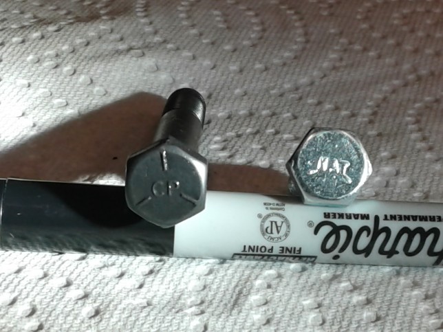 67 through 68 Z28 and l79 curved neck thermostat housing mounting bolts. Two sets - excellent original restored pieces. First set long bolt has CP head marking short bolt is NAT. Second set has the (**SOLD SBC (SOLD**) for the long bolt and M for the short bolt. $40 a set. (X)